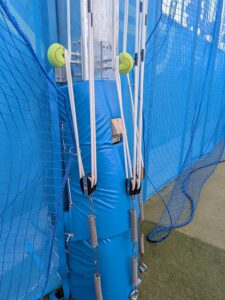 主な作業は鉄柱のクッション材巻き、仕切ネットの金具取付。